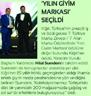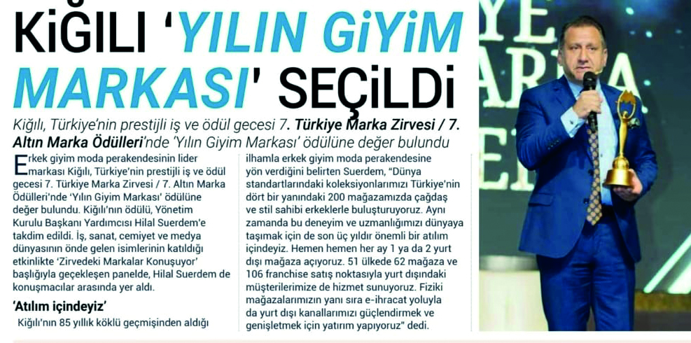 Türkiye Altın Marka Ödülleri’nde halk oylamasıyla “Yılın Uluslararası Giyim Markası” ödülünü kazandı. Tören çerçevesinde Kiğılı Yönetim Kurulu Başkanı Abdullah Kiğılı ise “Yaşam Boyu Başarı Ödülü”ne layık görüldü.