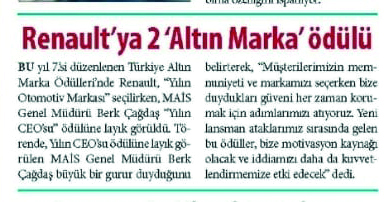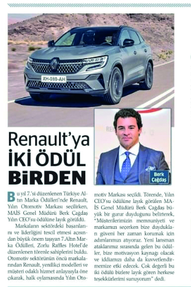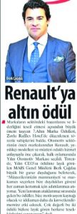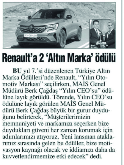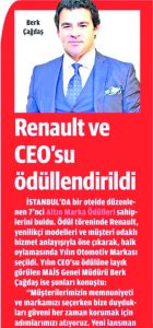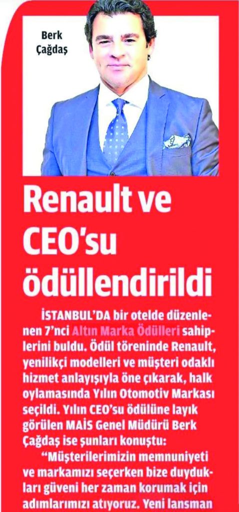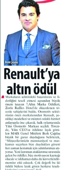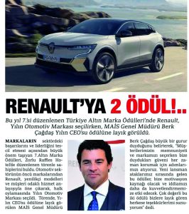 Bu yıl 5’incisi düzenlenen Türkiye Altın Marka Ödülleri’nde Renault, “Yılın Otomotiv Markası” seçildi.